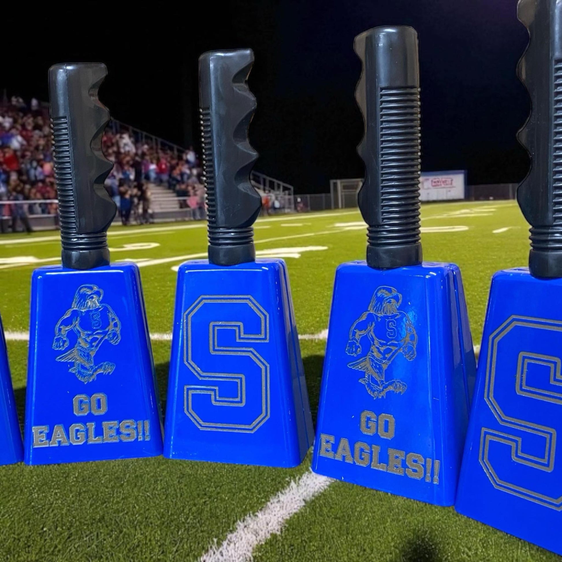 Make some noise for the Eagles this year with a laser engraved royal blue cowbell w/handle!